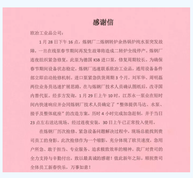 用户的需求就是军令,接到用户紧急联络后,备件品类中心通用设备备件部立即启动应急保供机制。在线水泵为凯士比进口产品,货期3个月以上,为确保春节期间设备状态稳定,通用设备备件部协同用户、国内设备制造商共同制定了国产泵替代方案。经过4小时加急赶制,水泵29日晚23点送达现场并连夜安装,30日上午已正常投入使用。从29日9点启动到23点送达现场,14小时,充分体现了欧冶工业品的“使命必达,欧贝速度”,得到了用户的高度赞扬。